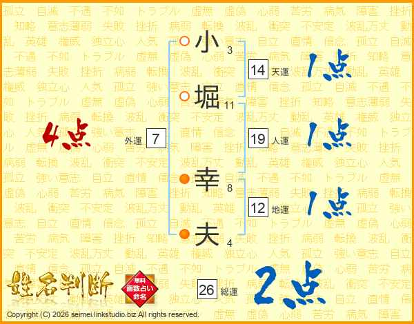 小(3画)堀(11画) 幸(8画)夫(4画)