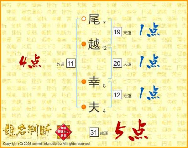 尾(7画)越(12画) 幸(8画)夫(4画)