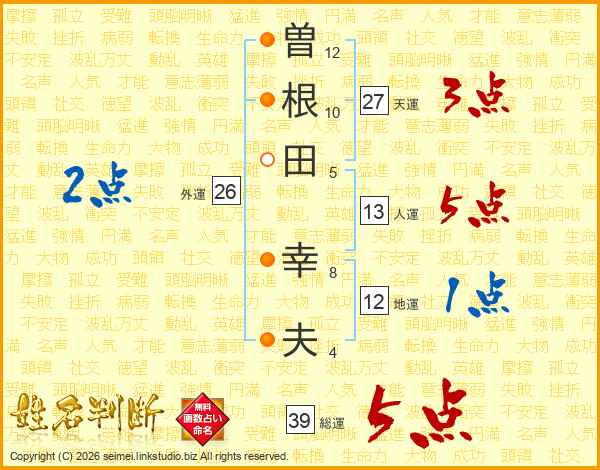 曽(12画)根(10画)田(5画) 幸(8画)夫(4画)