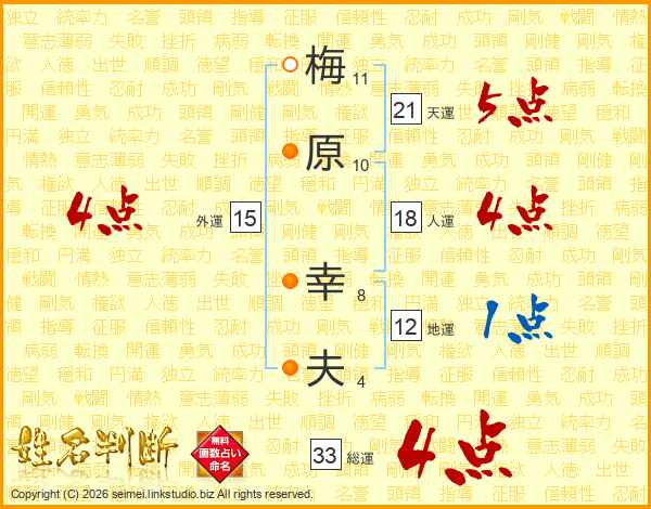 梅(11画)原(10画) 幸(8画)夫(4画)