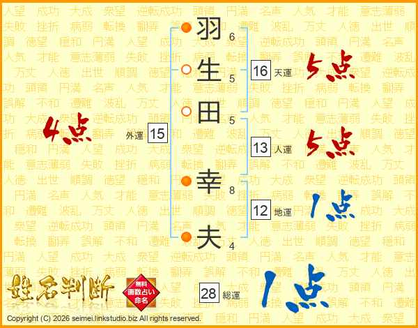 羽(6画)生(5画)田(5画) 幸(8画)夫(4画)