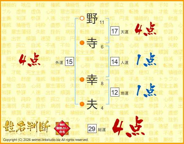 野(11画)寺(6画) 幸(8画)夫(4画)