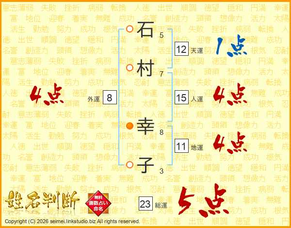 石(5画)村(7画) 幸(8画)子(3画)
