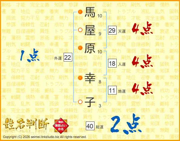 馬(10画)屋(9画)原(10画) 幸(8画)子(3画)