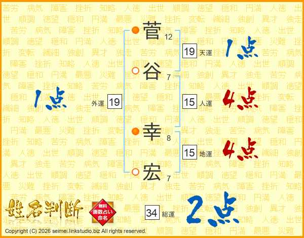 菅(12画)谷(7画) 幸(8画)宏(7画)