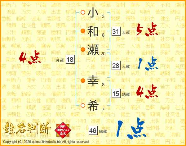 小(3画)和(8画)瀬(20画) 幸(8画)希(7画)