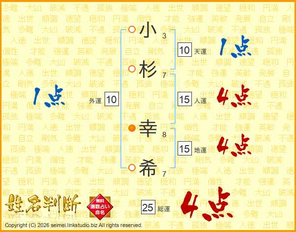 小杉幸希さんの総運は25画の4点!