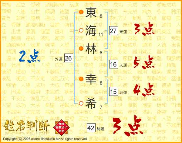 東(8画)海(11画)林(8画) 幸(8画)希(7画)