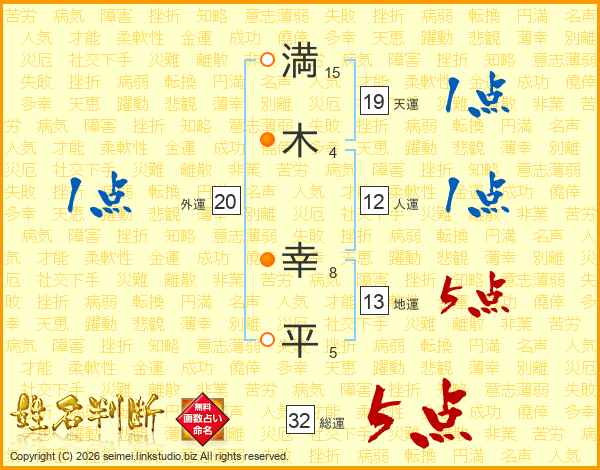 満(15画)木(4画) 幸(8画)平(5画)