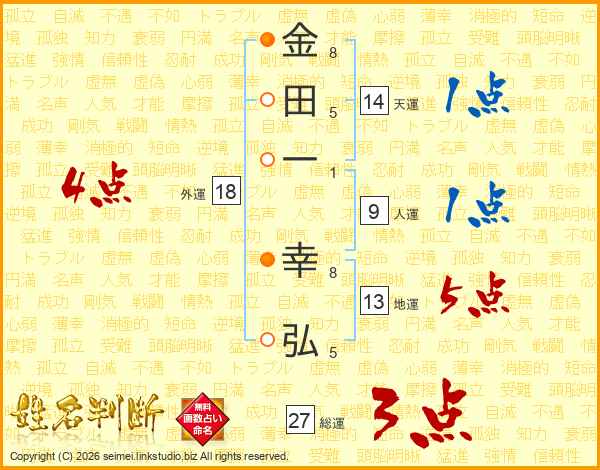 金(8画)田(5画)一(1画) 幸(8画)弘(5画)