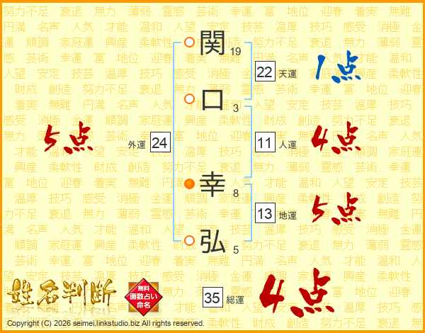 関(19画)口(3画) 幸(8画)弘(5画)