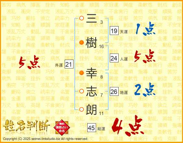 三(3画)樹(16画) 幸(8画)志(7画)朗(11画)