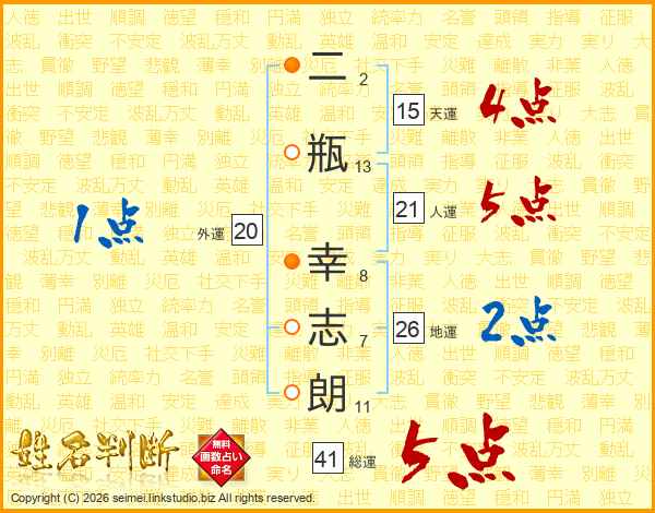画数の奇数(○陽)と偶数(●陰)の配列で吉凶を占います。どちらかにかたよる名前は大凶名で避ける必要があります。画数の奇数偶数。