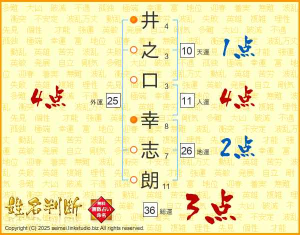 井(4画)之(3画)口(3画) 幸(8画)志(7画)朗(11画)