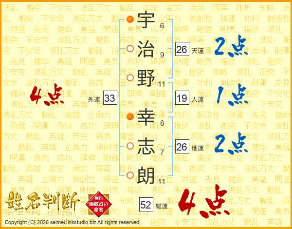 宇(6画)治(9画)野(11画) 幸(8画)志(7画)朗(11画)