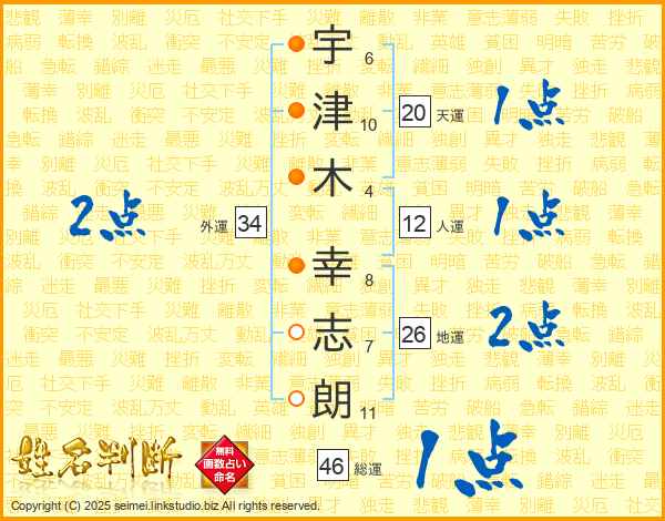 宇(6画)津(10画)木(4画) 幸(8画)志(7画)朗(11画)