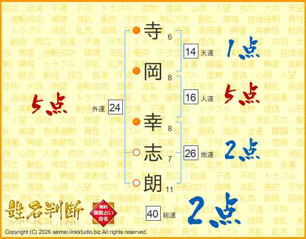 寺(6画)岡(8画) 幸(8画)志(7画)朗(11画)