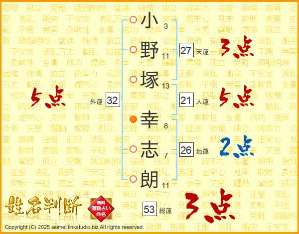 小(3画)野(11画)塚(13画) 幸(8画)志(7画)朗(11画)