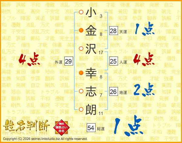 小(3画)金(8画)沢(17画) 幸(8画)志(7画)朗(11画)