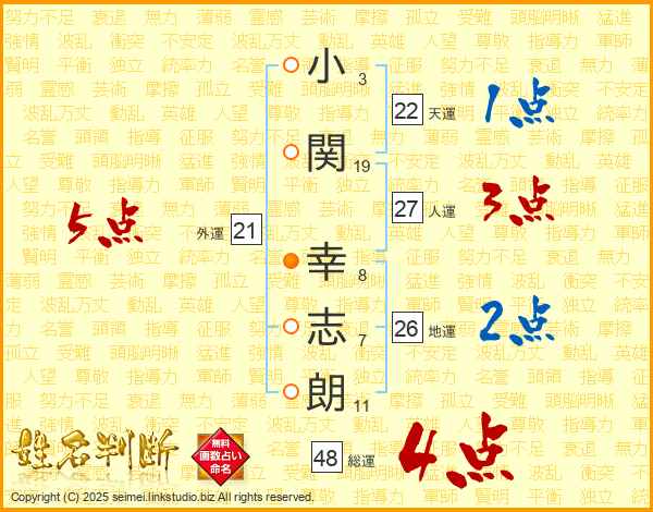小(3画)関(19画) 幸(8画)志(7画)朗(11画)