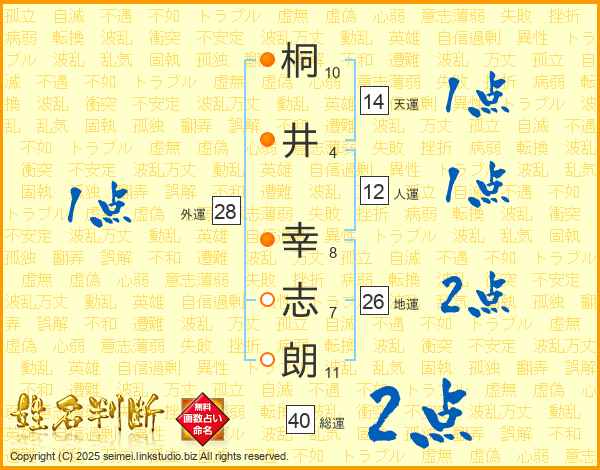 桐(10画)井(4画) 幸(8画)志(7画)朗(11画)