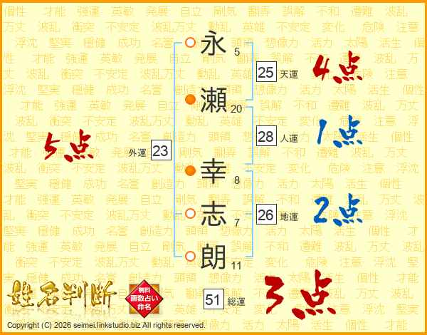 永(5画)瀬(20画) 幸(8画)志(7画)朗(11画)