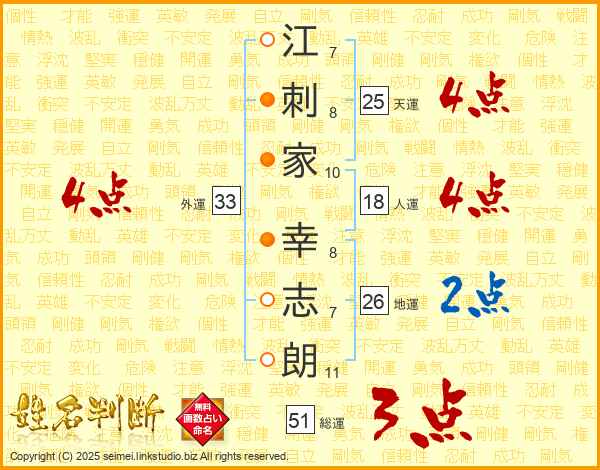 江(7画)刺(8画)家(10画) 幸(8画)志(7画)朗(11画)