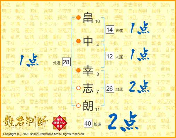 畠(10画)中(4画) 幸(8画)志(7画)朗(11画)