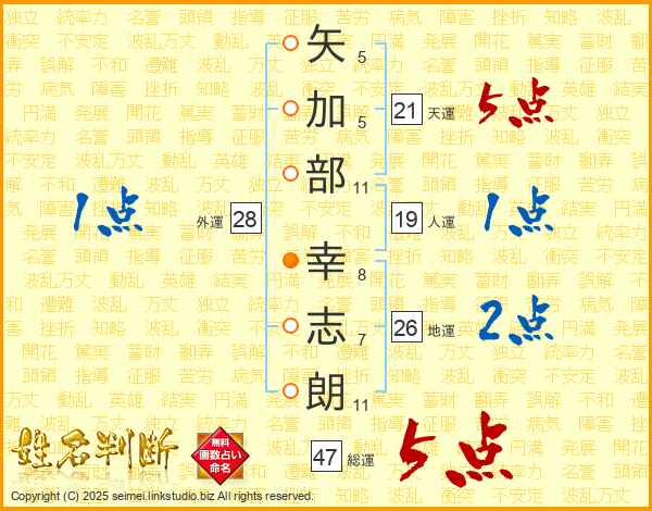 矢(5画)加(5画)部(11画) 幸(8画)志(7画)朗(11画)