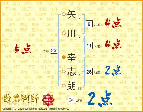 矢(5画)川(3画) 幸(8画)志(7画)朗(11画)