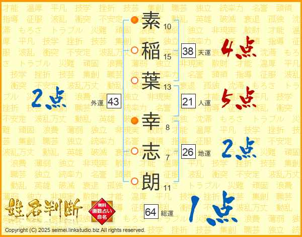 素(10画)稲(15画)葉(13画) 幸(8画)志(7画)朗(11画)