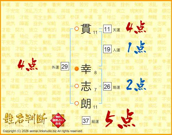 貫(11画) 幸(8画)志(7画)朗(11画)