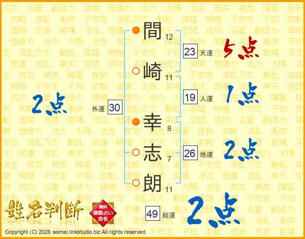 間(12画)崎(11画) 幸(8画)志(7画)朗(11画)