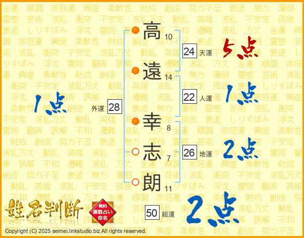 高(10画)遠(14画) 幸(8画)志(7画)朗(11画)