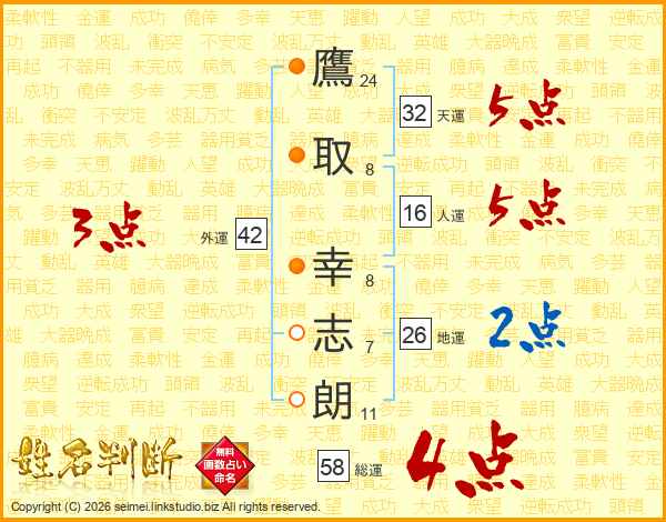 鷹(24画)取(8画) 幸(8画)志(7画)朗(11画)