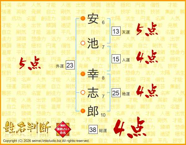 安(6画)池(7画) 幸(8画)志(7画)郎(10画)