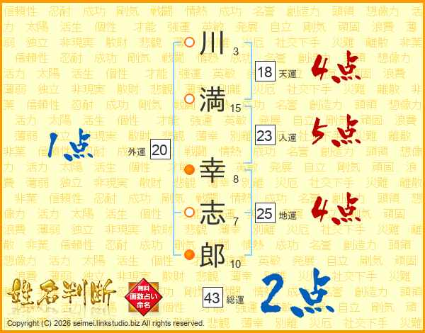 川(3画)満(15画) 幸(8画)志(7画)郎(10画)