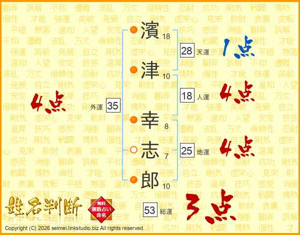 濱(18画)津(10画) 幸(8画)志(7画)郎(10画)