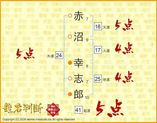 赤(7画)沼(9画) 幸(8画)志(7画)郎(10画)