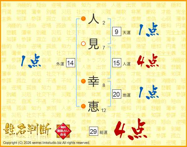 生活面を象徴する運勢です。外部から受ける影響力を表し、結婚運、家庭運や職場、環境への順応性を表します。総運から人運を引いた画数。姓や名が1文字の場合を除く。