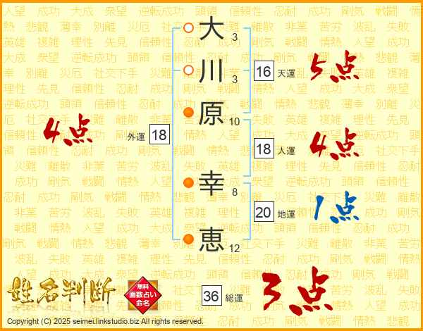 大(3画)川(3画)原(10画) 幸(8画)恵(12画)