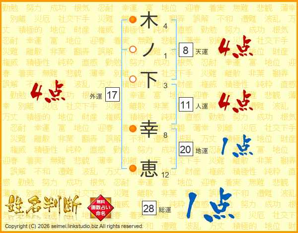 木(4画)ノ(1画)下(3画) 幸(8画)恵(12画)