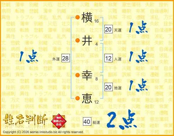 横(16画)井(4画) 幸(8画)恵(12画)