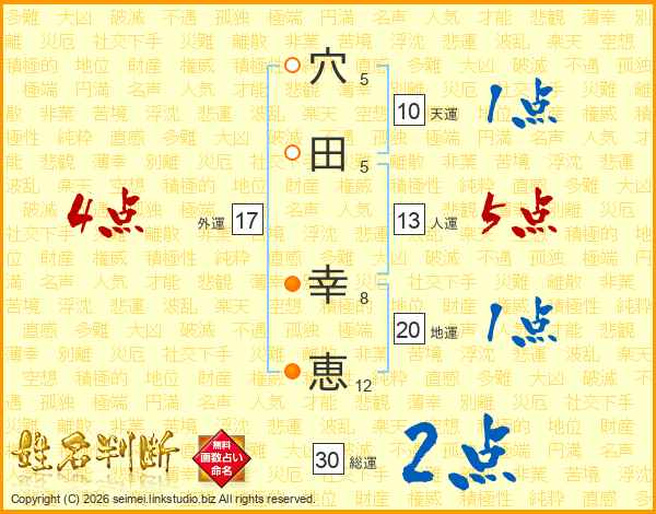 穴(5画)田(5画) 幸(8画)恵(12画)