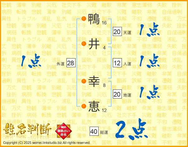 鴨(16画)井(4画) 幸(8画)恵(12画)