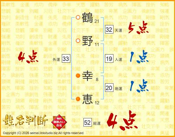 鶴(21画)野(11画) 幸(8画)恵(12画)