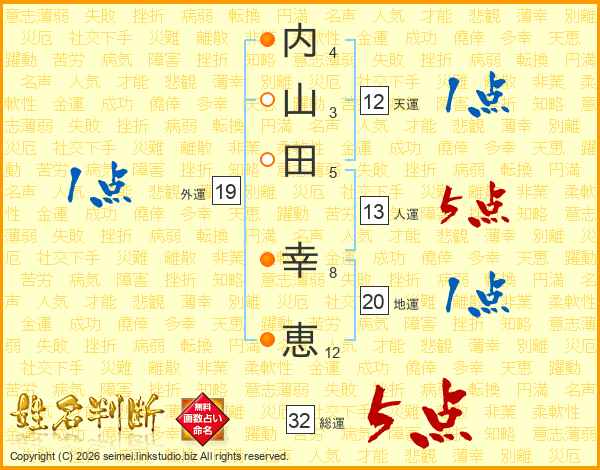内(4画)山(3画)田(5画) 幸(8画)恵(12画)