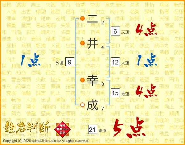 生活面を象徴する運勢です。外部から受ける影響力を表し、結婚運、家庭運や職場、環境への順応性を表します。総運から人運を引いた画数。姓や名が1文字の場合を除く。