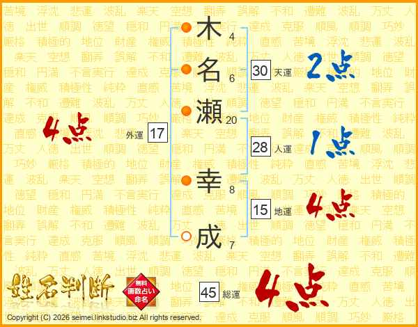 木(4画)名(6画)瀬(20画) 幸(8画)成(7画)