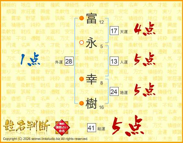 富(12画)永(5画) 幸(8画)樹(16画)